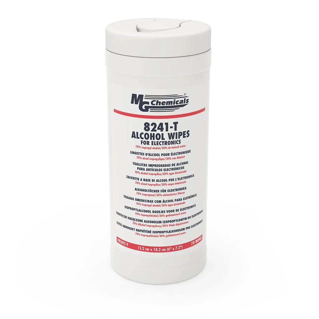 MG Chemicals 8241-T Alcohol Wipes are designed for cleaning delicate electronic assemblies. Pre-saturated with alcohol, they offer fast drying, effective removal of contaminants, and safe use on plastics and sensitive surfaces.