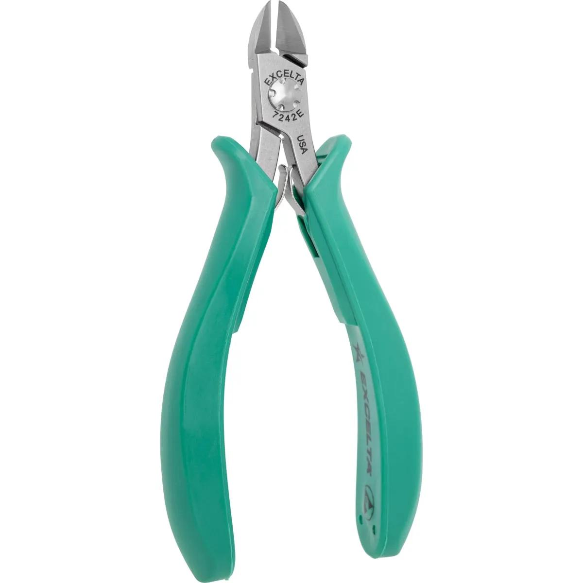 Cutter is made of carbon tool steel with induction hardened cutting blades to RHC 63-65. The CNC machining allows the joint surfaces to be perfect to allow for long life. The grips are soft cushioned foam and are static-dissipative (10^8 Ohm/sq). The dual leaf springs provide smooth action. - Excelta 7200 Lazer Line side cutter.