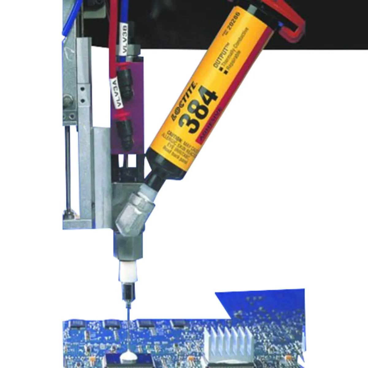 Loctite 384 Thermal Adhesive. LOCTITE® 384 is a white to off-white, 1-part, thermally conductive, modified acrylic paste adhesive designed for bonding heat generating components to heat sinks. The high thermal conductivity provides excellent heat dissipation for thermally sensitive components, while the controlled strength permits field and service repair. It should be limited to a maximum of 500 V in high pot applications.