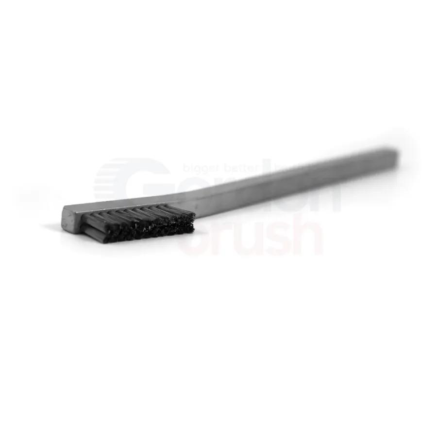 This brush has 0.003" stainless steel wire with a Delrin (Acetal) handle. The stainless steel wire is hand-laced with stainless steel wire into its handle for maximum wire retention. These brushes are great for removing stubborn dirt, light rust or corrosion on detailed parts. This brush safely cleans most tarnished metals, but can leave a dull finish on soft metals.