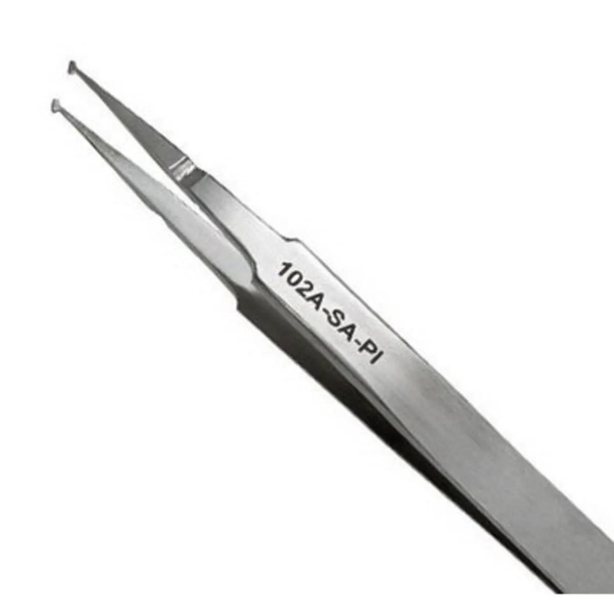 The wider point has been designed for easy manipulation of most chips and miniature components. Anti-crush device has been added to reduce chip breakage. - Excelta Fine Precision Surface Mount Chip Handling Anti-Magnetic Tweezer, Length: 4.5 Inch, Tip Size: 0.07 Inch W x 0.031 Inch Thick, Point Type: Paddle, Material: Stainless Steel, Resists: Acid, Corrosion.
