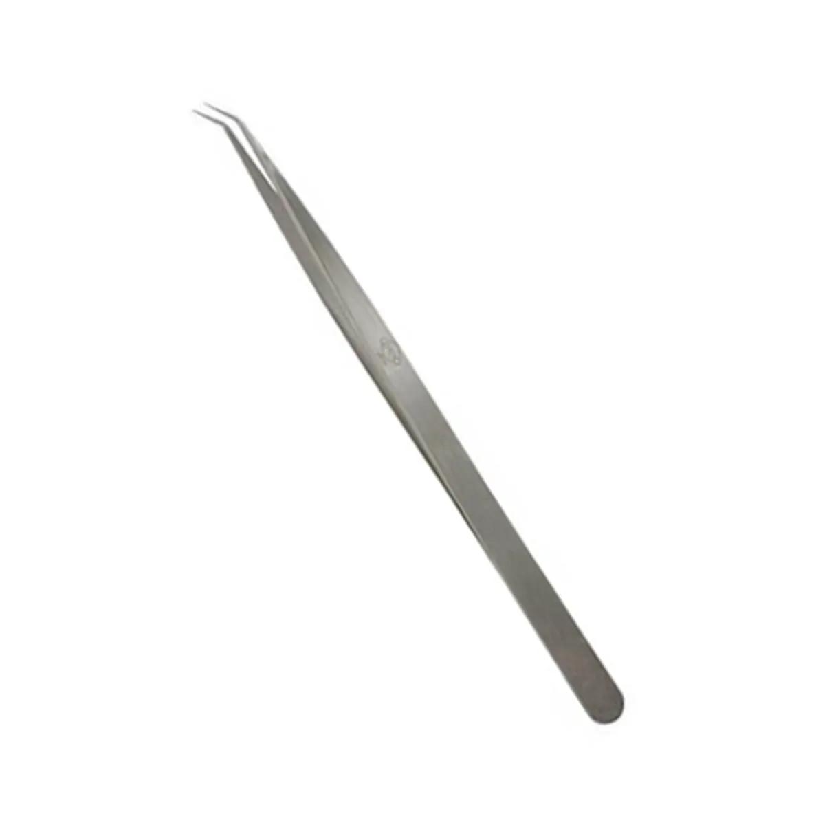 Precision tweezers with curved very pointed tips used for working with extra-small chips and other miniature components. - Erem Anti-Magnetic Tweezer, Length: 5.5 Inch, Point Type: Curved, Micro Fine, Material: Stainless Steel, 150 °Cutting Angle, Resists: Acid, Heat, Rust.