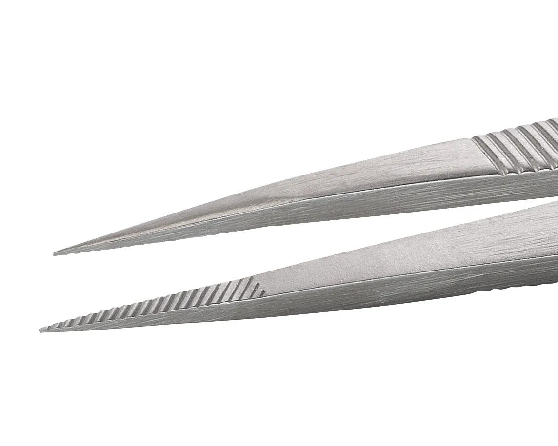 Ideal-tek Type 00D premium economy tweezers made of anti-magnetic and anti-acid stainless steel, designed for securely holding components. Features thick, squared, strong tips and a sandblasted finish.